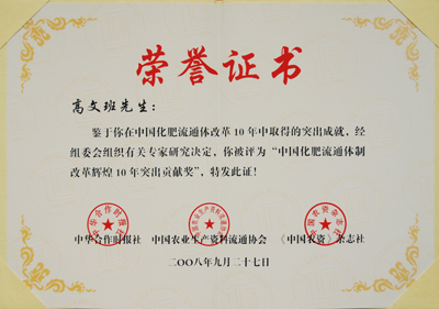 董事長高文班榮獲中國化肥流通體制改革輝煌十年個(gè)人突出貢獻(xiàn)獎(jiǎng)
