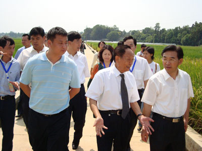 圖為農(nóng)業(yè)部副部長張?zhí)伊值阮I(lǐng)導在雜交水稻之父袁隆平院士、公司總經(jīng)理高進華的陪同下,參觀良種良肥推廣示范田