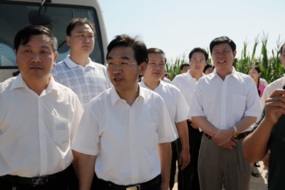 農(nóng)業(yè)部副部長張?zhí)伊郑ㄇ芭抛蠖?、山東省副省長賈萬志(右一)在史丹利化肥公司總經(jīng)理助理張磊博士陪同下,
