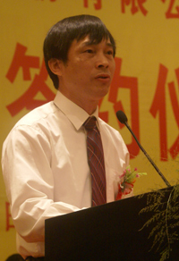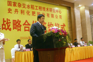 在簽約儀式上,袁隆平先生發(fā)表了熱情洋溢、感人至深的講話。他說,我國雜交水稻研究與應(yīng)用一直處于世界領(lǐng)先水平。上世紀七十年代,我國在世界上率先成功育成三系雜交水稻。據(jù)不完全統(tǒng)計,1976年至2007年,全國雜交水稻累計種植50億畝,累計增產(chǎn)稻谷近五千億公斤,為確保我國糧食安全做出了突出貢獻。近年來,我國超級雜交水稻研究,又取得重大成果,分別于2000年和2004年實現(xiàn)了農(nóng)業(yè)部的百畝示范片畝產(chǎn)700公斤和畝產(chǎn)800公斤的第一、第二期超級稻產(chǎn)量目標(biāo)?,F(xiàn)在,正在全面實施用三畝地產(chǎn)出現(xiàn)有四畝地水稻總量的豐產(chǎn)工程,攻關(guān)畝產(chǎn)900公斤第三期超級雜交水稻,力爭在2010年實現(xiàn)。但是,也應(yīng)當(dāng)清醒地看到,在南方稻區(qū)大面積實現(xiàn)“種三產(chǎn)四”的工程目標(biāo),必須著重解決好良種與良法的配套問題,迫切需要涉農(nóng)企業(yè)的支持與合作。今天,中國著名的復(fù)合肥企業(yè)史丹利化肥公司對雜交水稻的發(fā)展給予了高度關(guān)注和巨大支持,為實現(xiàn)強強聯(lián)合,創(chuàng)新良種良肥配套,走出了一條嶄新的路子。袁隆平院士全局的視野、創(chuàng)新的理念、淵博的知識,充分體現(xiàn)了這位科學(xué)巨人對祖國的赤誠之心,對雜交水稻技術(shù)的高度執(zhí)著和對“三農(nóng)”工作的深切關(guān)懷,給與會人員留下了難以忘懷的深刻印象。史丹利公司董事長高文班在致辭中全面回顧了史丹利公司牢記歷史使命,創(chuàng)造美好農(nóng)業(yè),創(chuàng)造中國復(fù)合肥著名品牌,服務(wù)“三農(nóng)”所走過的輝煌歷程。他著重強調(diào)必須加快科技創(chuàng)新步伐,發(fā)揮自身優(yōu)勢,尋求戰(zhàn)略合作,強力構(gòu)建技術(shù)創(chuàng)新平臺,盡快使史丹利復(fù)合肥創(chuàng)新成果得到廣泛應(yīng)用。今天,史丹利公司與國家雜交水稻工程技術(shù)研究中心締結(jié)戰(zhàn)略聯(lián)盟,將實現(xiàn)良種良肥的有效鏈合,為共同推進我國雜交水稻事業(yè)的健康發(fā)展,提升史丹利品牌形象和市場地位將產(chǎn)生重大而深遠的影響。