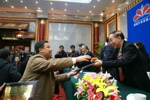 圖為全國人大常委會常委楊興富為史丹利公司總經(jīng)理高進(jìn)華頒發(fā)第二屆中國農(nóng)民喜愛的農(nóng)資獎牌