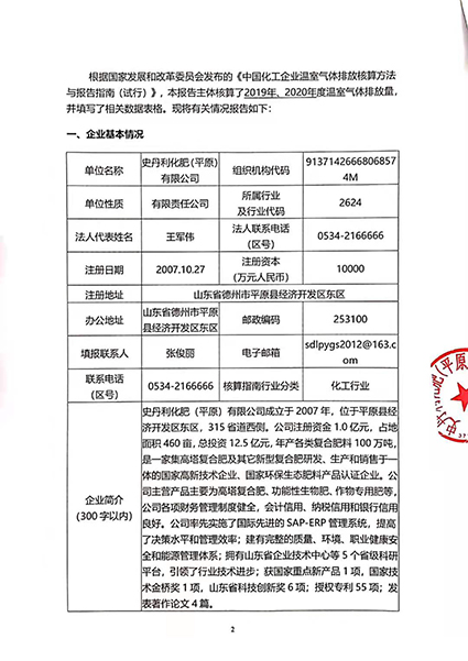 史丹利化肥(平原)有限公司溫室氣體排放報(bào)告及核查報(bào)告